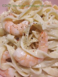 The maiden voyage was a very simple fettucine, with leftover shrimp, and a “easy melt butter with cream in a pan then add your noodles and handfuls of grated cheese” sauce that I will never make again because all my beautiful Grana Padano stuck to the bottom of the pan.