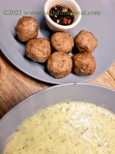 The quilter who submitted this recipe to the 1990s “quick meals from quilters” cookbook I bought in a bookstore in an indoor shopping mall(!) called this “Cream of Zucchini” but around here it is Grinch Soup, and I served it with Jingtinglers for #MeatballMonday. Somebody please get the reference and laugh. Please.