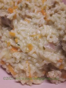 We had a cheese fondue on Silvester (New Year’s Eve) and there was some white wine leftover. I paired it with some carrots that had to be used up, chicken, rice, and a whole head of Spanish garlic, chopped instead of shaved. Maybe next time. I won’t call it Risotto, but the consistence is not dissimilar.