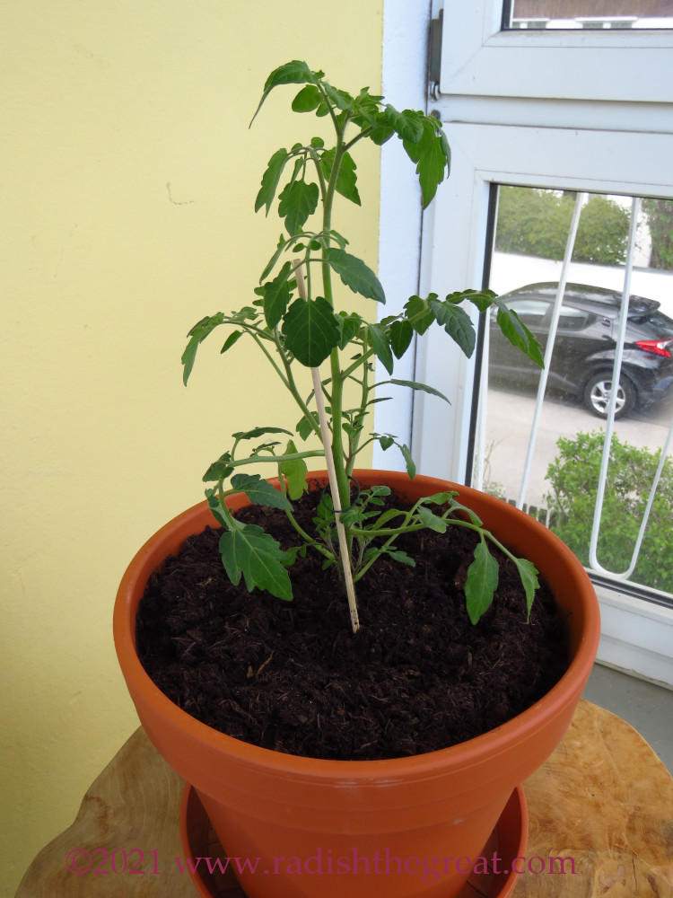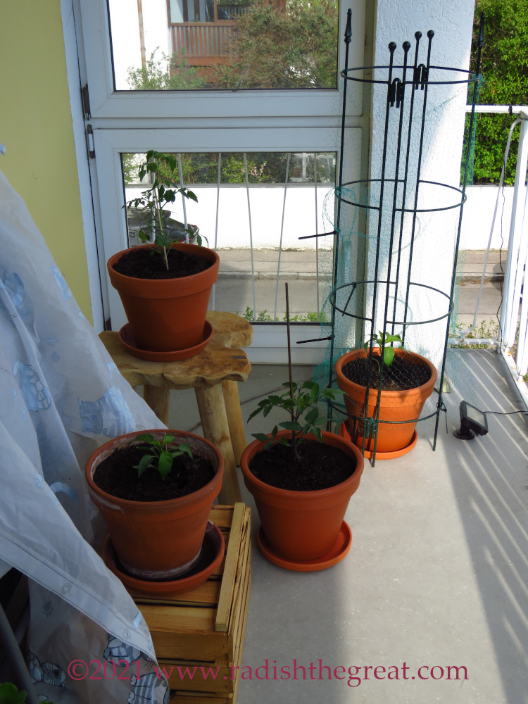 Everything is probably not in its final place yet, I just finished potting them all today. There is one Johannisbeertomate (on the teak table), a Peruvian variety which yields fruits the size of currants, and one Indigo Rose (on the floor), that won’t give me any fruit until late August but I’ll have fun watering it for four months! (The linked German tomato blogger did not care for the taste of the Indigo Rose, but I don’t grow weird colors for the taste…)