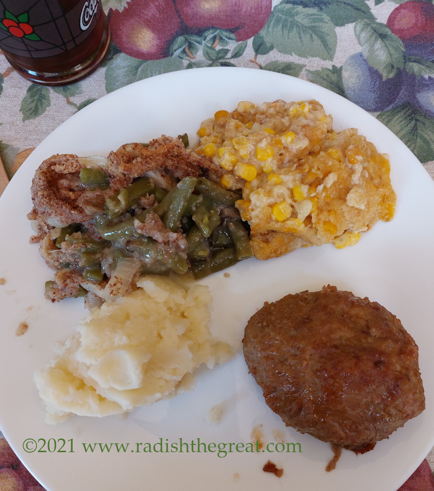 While I was visiting my family, I asked for Real Iowa Ham Balls, and was told I could make them for Second Thanksgiving. Sort of. My sister eats gluten- and dairy-free, so for the family meal I was asked to use almond milk and a box of crackers containing plenty of sugar but no graham flour. At least the main ingredient–the ground ham mixed with ground pork–was there, conveniently pre-mixed at the meat counter.