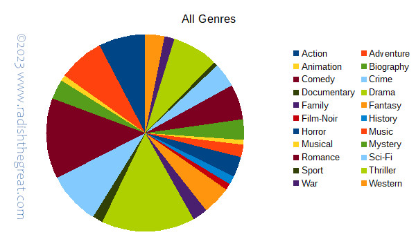 Now that that’s out the way, a look at genre. Obviously, films can have multiple genres–an animation can also be a comedy and a mystery and a family film–but the IMDB lists them alphabetically, and I find this approach unhelpful because it is difficult to determine the main category without looking at each film individually.