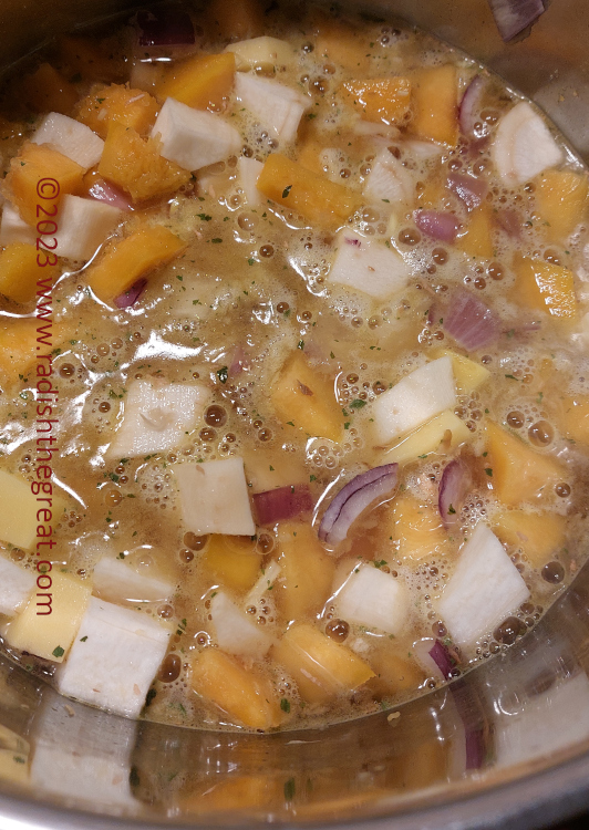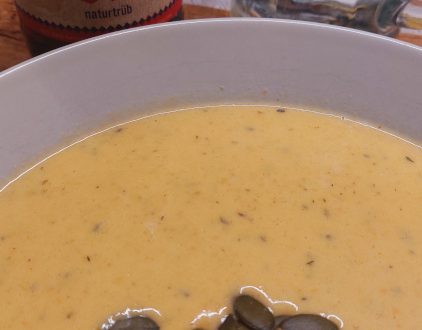 (Tangent: Einlage. The inserts I put in my shoes when I had plantar fasciitis are called Einlage. The cards that fall out of magazines are called Einlage. Bits of meat/veg/toast/nuts that Germans lay in their broth and cream soups are called Einlage. These are the things I think about while I’m butchering squash.)