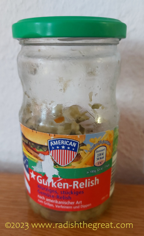 Five years ago, I got delicious, sugary, American-style pickle relish from a German grocery Discounter during their annual “American”-food week, for about an Euro. It tasted like the cheap stuff my Dad bought from the same Discounter when I was growing up in Iowa, minus the neon-green food coloring. I only need it a couple times a year for baseball hot dogs, but with so much sugar and vinegar, it was still fine to eat after years in the fridge.