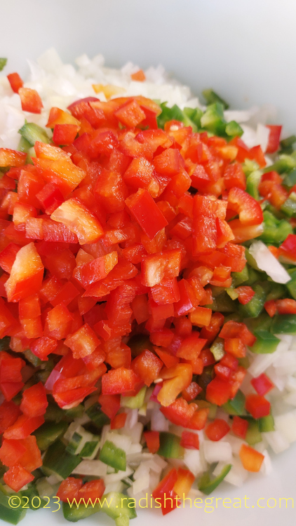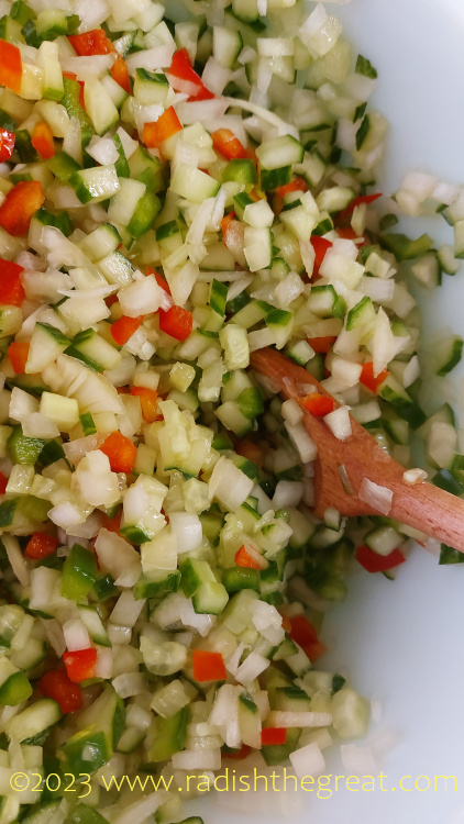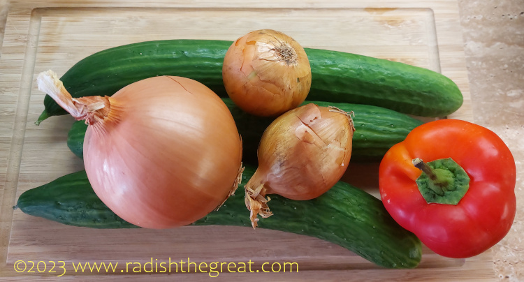 Pickle relish was developed to take advantage of the August glut of cucumbers, and make them shelf-stable so they could be enjoyed in winter. All the recipes I found started with ten pounds of cucumbers… At this time of year/German inflationary history, a single cucumber at the farmers market costs the same amount as a jar of six “American-style” hot dogs. Panic was turning quickly to despair…then there was a sale at the grocery store in the neighborhood and I scored three cukes for 3€. I weighed them, and adjusted a random recipe down.