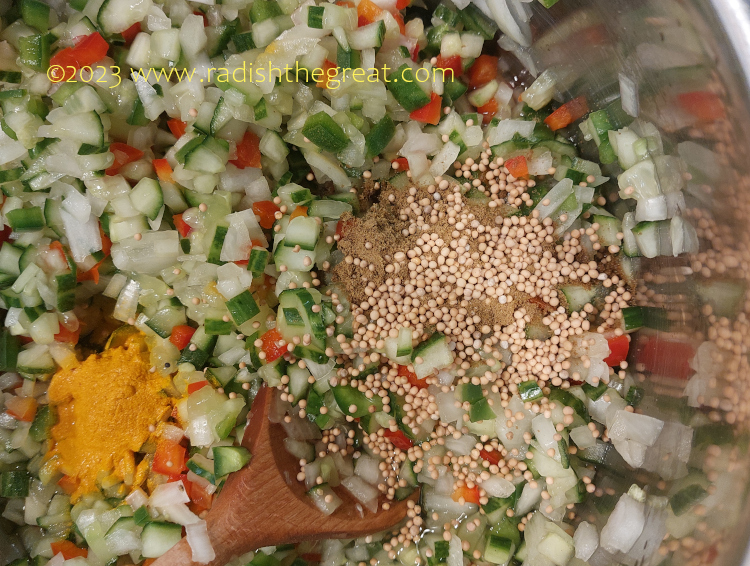 Into the pot, along with vinegar, mustard seed, turmeric, celery seed, and what seemed like a lot of sugar at the time.