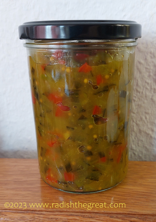 It’s good; spicier than the commercial variant, but not very sweet at all. Next time–I’m thinking August 2024–I will adjust the recipe down to one cucumber, chop it even smaller, and add more sugar. I put one jar in the freezer; I don’t know if the texture will hold through a freeze-thaw cycle, but I’m willing to take the risk in order to find out. The other two jars are ready for Opening Day. I have also been eating it on bread smeared with cream cheese. The race to finish it before it goes fuzzy is on!