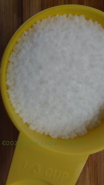 Simultaneously, I hunted down appropriate salt. “Pickling salt” turns up “Pökelsalz“, which is nitrates for sausage-making. Useful but wrong. I settled for “rustic Alpine salt“–from a mine that Mr Radish and I visited in 2008. Life is a series of circles.