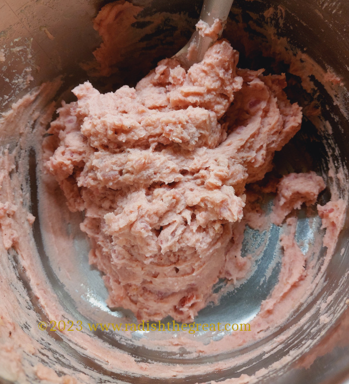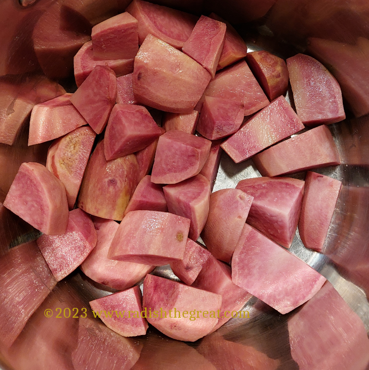 While all this is going on, I was working out my pink Stampf–with more cream. The trick here is to warm the cream before adding it to the potatoes (we watch a lot of cooking shows in German television).