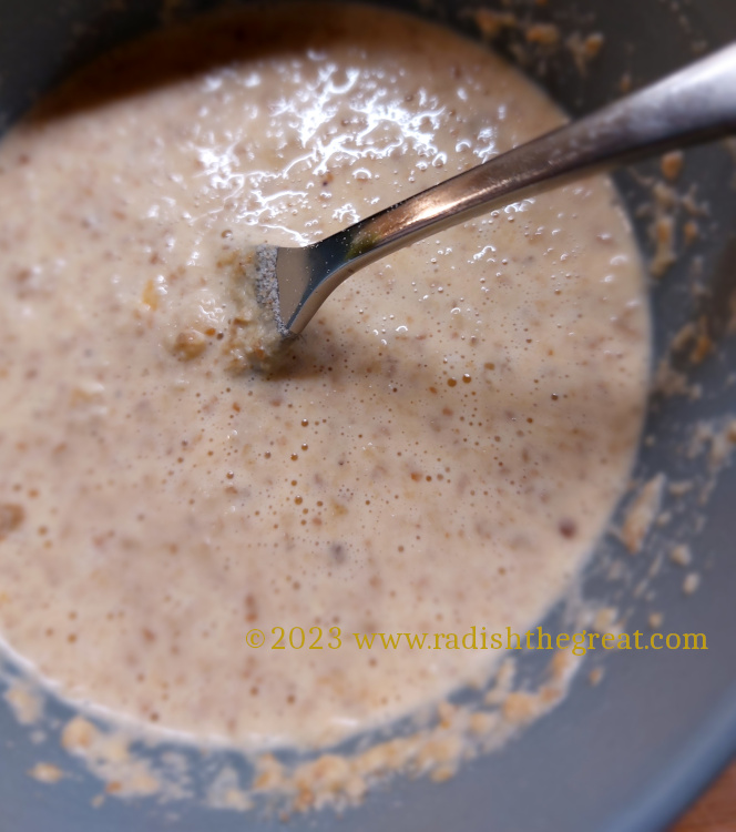 There is also cream in the balls. This recipe starts by soaking the breadcrumbs (“best self-made”, it says; I am all over that) in the beaten egg and 50mL of cream. Here I think it might be OK to substitute regular milk, because as I mentioned previously, the balls were a little dry. (I also think that may have been because my pan was too big for the volume of sauce. Double batch next time!)