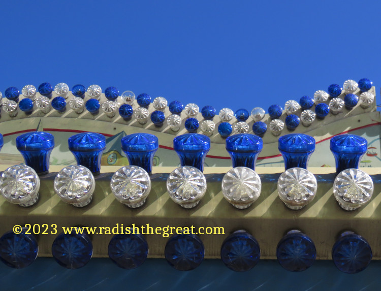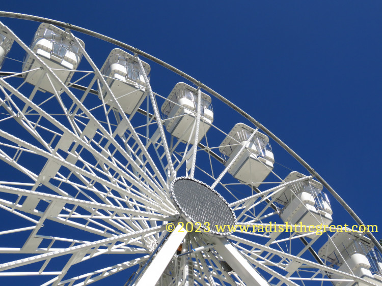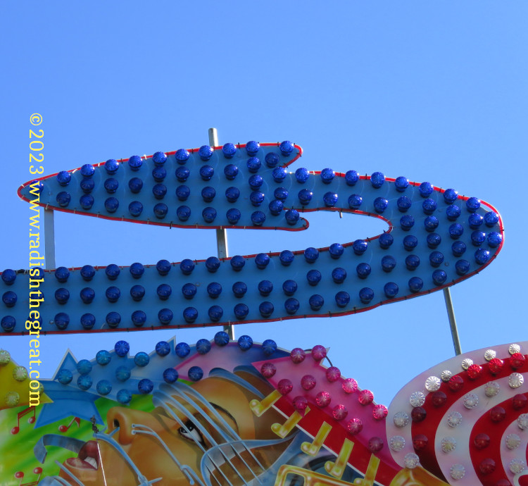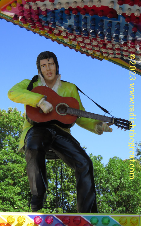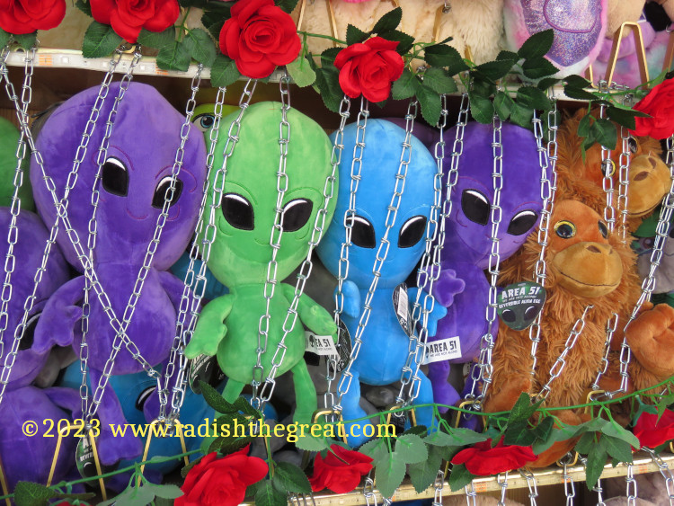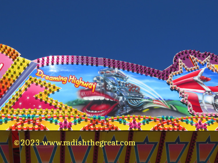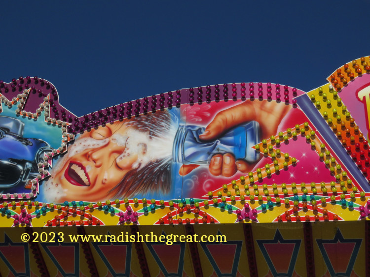 Alpine Churro. Eyeballs and a tongue? Really? Lol.I keep thinking someday I’ll render this sort of thing in fabric.Spider.Ticket counter of a scrambler-style ride.The façade above the bumper cars. And some more of the façade above the bumper cars. This will never be rendered in fabric.Palate cleanser.I wanted to take a picture of the arrow, but now I am disturbed by the woman with barbed wire up her nose.The King, not subject to casual sado-masochistic sexism for some reason. Everyone takes this picture.Prizes at the sharp-shooting stall.