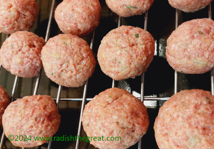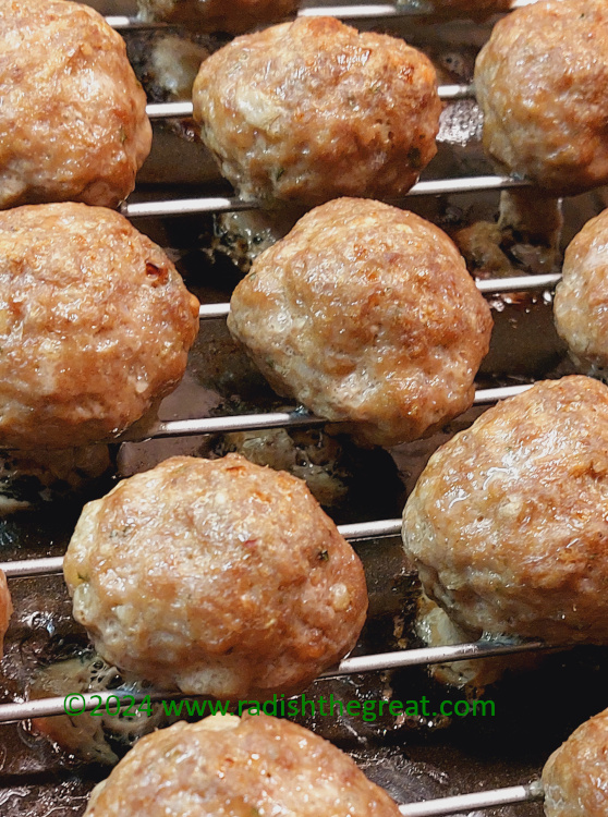 The balls are baked for half an hour, while the sauce simmers. The meatball mass wasn’t very wet, and with the fat dripping off the rack, I thought they might be dry. I used my broiler trick to get a little tasty crust on the tops.