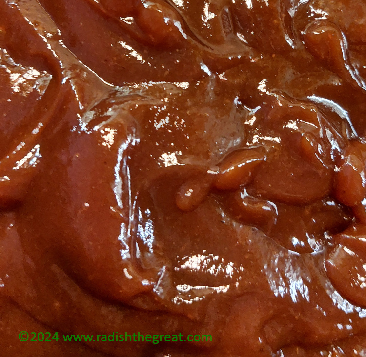 The sauce has a commercial BBQ sauce base, refined with ketchup, tomato paste, and brown sugar. My bottle of “American BBQ sauce” from a Discounter‘s Fake American Food Week was closer in texture to grape jelly than to sauce, so I substituted tomato sauce for the tomato paste and added extra water. The sauce simmered on the stovetop while the meatballs are prepared.
