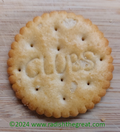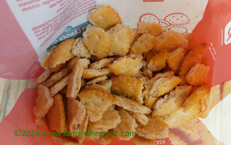 The German knock-off crackers–a brand name product, the style is the knock-off– are sold in plastic bags, for your pre-crushed convenience.