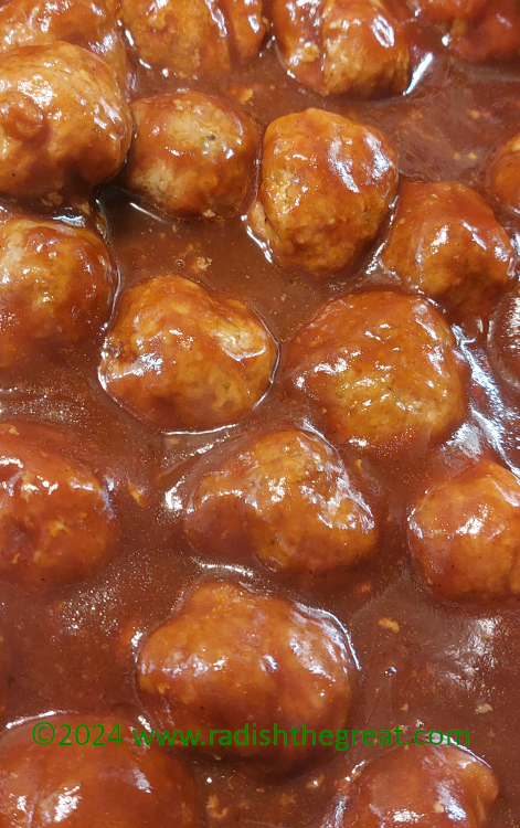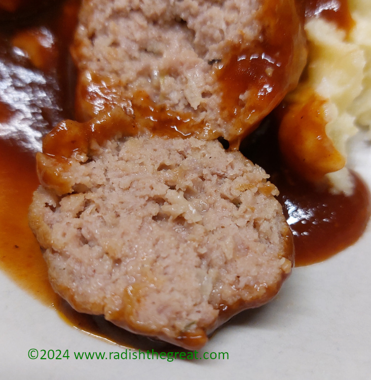 The sauce is–as expected–extremely sweet and a bit one-dimensional. Next time I will skip the brown sugar, and add some chili powder instead. The balls have a fine inner consistency, and despite the lack of liquid to soften up the cracker crumbs, were quite moist.