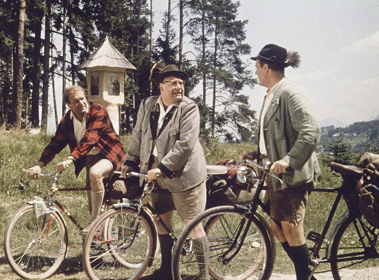 Light post-war German comedy (I wonder when the European film industry shifted to “suicide is comedy“?) about three middle-aged friends who take a bicycle trip through the mountains, like they did the summer they were 17 or 18. They’ve lost touch, but classics Professor Johannes (played by the father of frequent RadishFlixer Romy Schneider) gets the band back together, and they take off, headed for a village where they spent a couple of weeks falling in love back before the war.