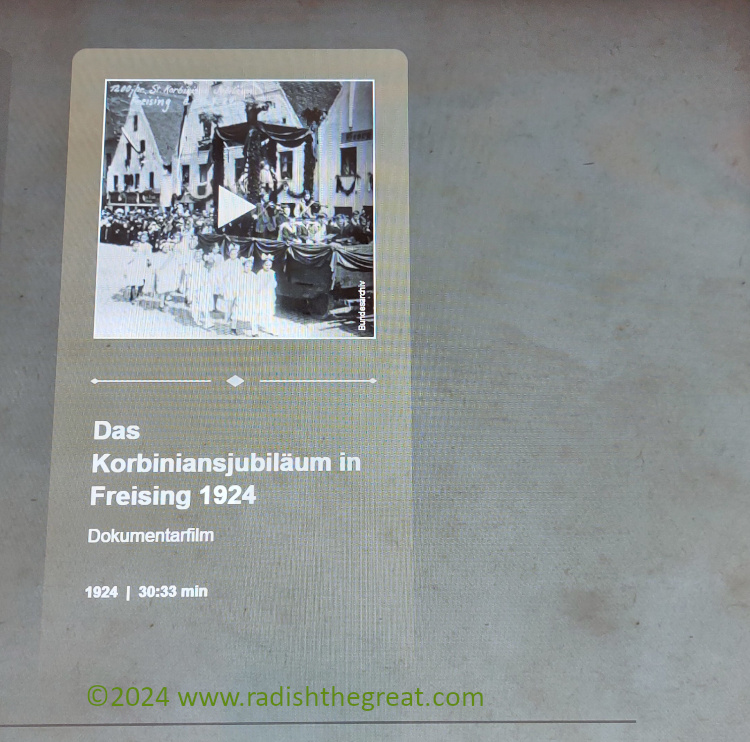 Documentary short film of the mass, parades, and “100,000 pilgrims arriving by train” for the last celebration of Korbinian’s arrival in Freising. It does kind of go on a bit–other museum visitors only lasted a few minutes, others walked right past–with endless footage of priests who don’t look thrilled to be there, but Mr Radish and I enjoyed trying to identify the streets and buildings, the cars, and the fashions. The priests in particular–about a fourth of them were wearing the same lace on their formal garment (sorry, I am unfamiliar with the terminology), but the rest all had different patterns and symbols. Also–you can see them in my Bad Handy Foto–all the little girls with big floppy hair bows.