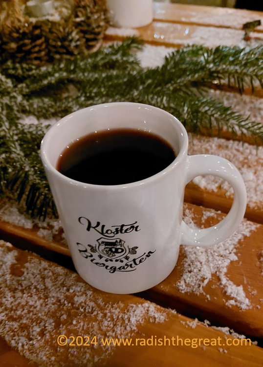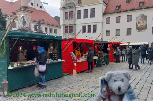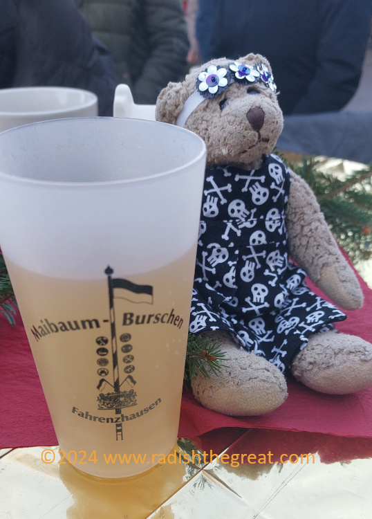 The Biergarten itself was small, and the only food was from their kitchen–lots of savory options, but not enough sweet treats for Mr Radish’s tastes. He had a spiral-cut fried potato, and I enjoyed a half-meter-long Feuerwurst, which had some chili inside but was more seasoned than hot. Where they shone was the variety of different flavors for Glühwein (“mulled” wine, hot and spiced) and alcohol-free hot fruit punches. I can’t remember if I’ve had Blueberry Glühwein before–I may have bought a bottle during one of the Lockdown Christmases–but this one was excellent. Plus, since it was all organized by the professional Biergarten staff, it was very organized and efficient.