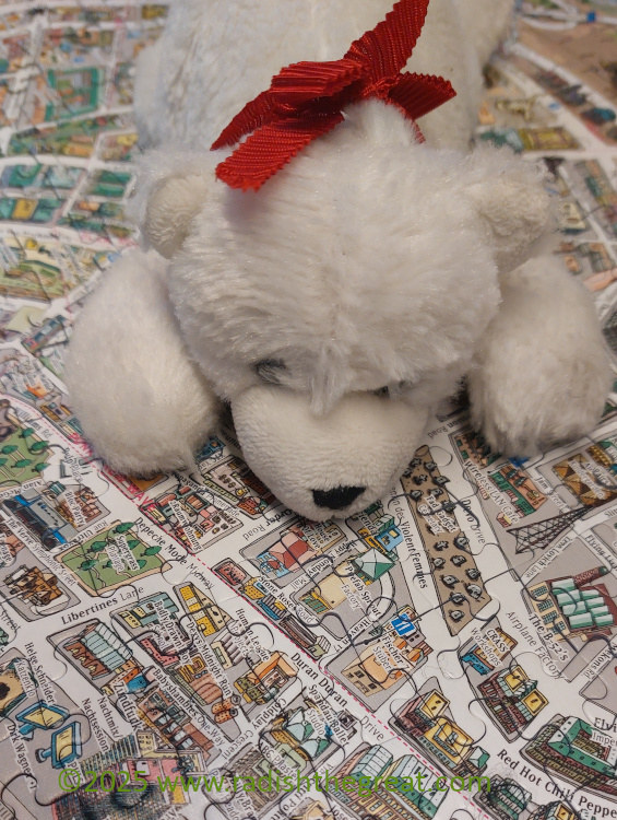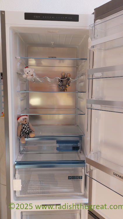 Finally something interesting to report: On Tuesday, I opened the freezer for “the good” butter for Christmas cookies, and water sloshed out onto the floor. The fridge compartment was also warm, nearly room temperature. So I spent my afternoon throwing out thawed-out fish and liquid ice cream while Mr Radish organized a new one.