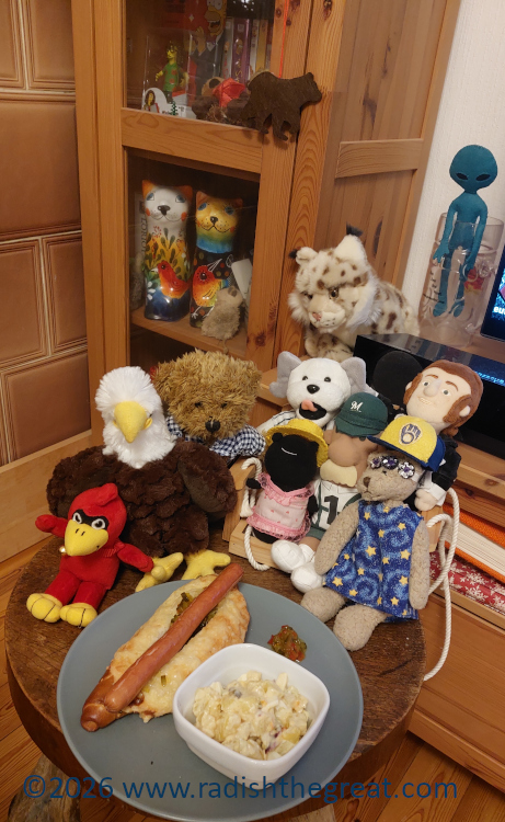 Air-fried hot dog with homemade relish and American potato salad, also with relish.